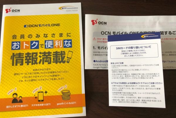 SIMカードと「OCNモバイルOneの設定書類」が一緒になっています。
