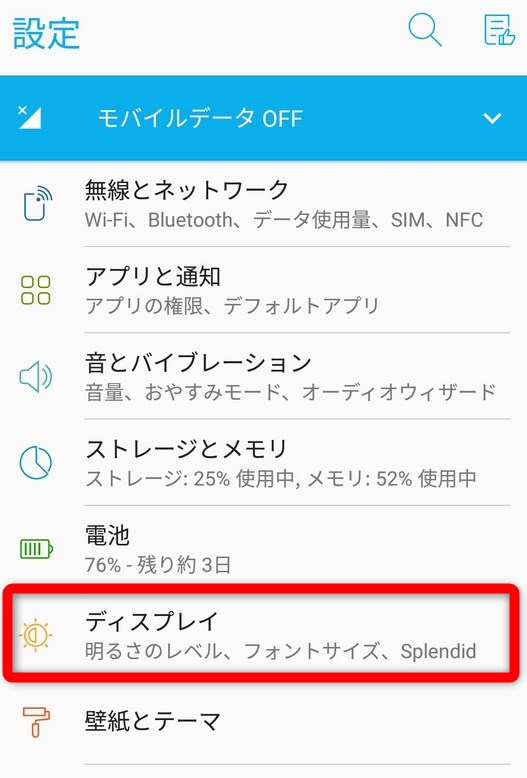 「設定アプリ」から開くと、一覧から、「ディスプレイ」を選択しましょう。